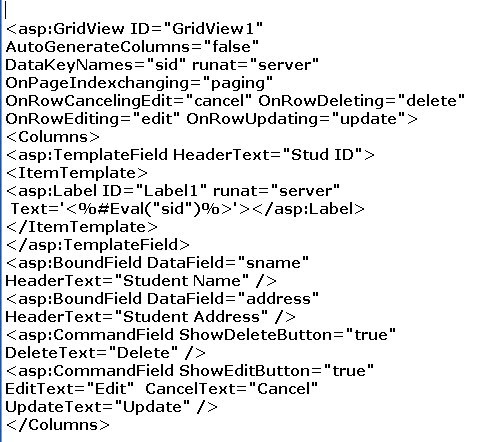 c.cmd.CommandText = "update student set sname='"+ t1.Text+ "', address='"+ t2.Text+"' where sid='" + GridView1.DataKeys[e.RowIndex].Value.ToString() + "'";